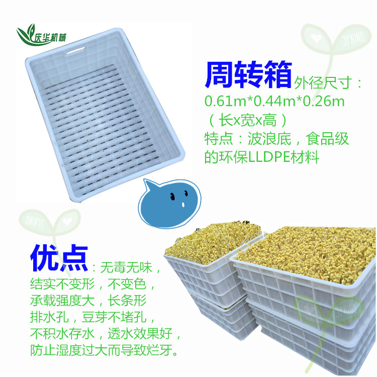 4)周轉(zhuǎn)箱的外徑尺寸:0.61m*0.44m*0.26m(長(zhǎng)寬高),特點(diǎn):波浪底,食品級(jí)的環(huán)保LLDPE材料,無(wú)味,結(jié)實(shí)不變形,不變色,承載強(qiáng)度大,長(zhǎng)條形排水孔,豆芽不堵孔,不積水存水,透水效果好,防止?jié)穸冗^(guò)大而導(dǎo)致?tīng)€牙。