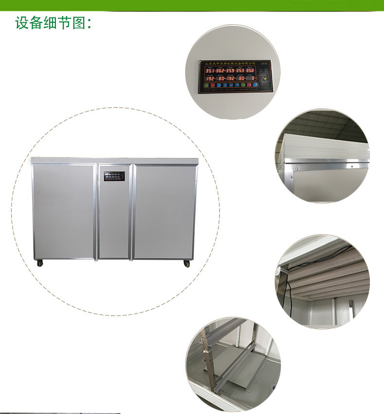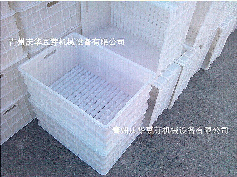 2、主要用途: 廣泛適用于大型戶 3.豆芽生產(chǎn)流程: 選擇芽豆 →→ 對(duì)豆種清洗并做無(wú)菌處理 →→ 浸種(適宜水溫) →→ 裝機(jī)(每箱約5斤干豆) →→ 啟動(dòng)豆芽機(jī),設(shè)定合理參數(shù) →→ 對(duì)育芽室做無(wú)菌處理 →→ 1天后觀察豆芽生長(zhǎng)情況 →→ 2天后觀察豆芽生長(zhǎng)情況 →→ 3天后觀察豆芽情況 →→ 4天后收獲豆芽 →→ 豆芽清洗后包裝,上市。 4、豆芽機(jī)制造流程: 5、豆芽機(jī)產(chǎn)品特點(diǎn): 5)減少爛芽現(xiàn)象。豆芽生長(zhǎng)的爛芽現(xiàn)象多發(fā)生在培育后的三天左右,由于手工生產(chǎn)豆芽的周期長(zhǎng),易出現(xiàn)爛芽現(xiàn)象,然而采用豆芽機(jī)生產(chǎn),三天左右豆芽已經(jīng)成熟,可以采收食用,不會(huì)有爛芽現(xiàn)象發(fā)生。 6、豆芽機(jī)結(jié)構(gòu)特點(diǎn)及功能(可根據(jù)客戶需要訂做): 4)周轉(zhuǎn)箱的外徑尺寸:0.61m*0.44m*0.26m(長(zhǎng)寬高),特點(diǎn):波浪底,食品級(jí)的環(huán)保LLDPE材料,無(wú)味,結(jié)實(shí)不變形,不變色,承載強(qiáng)度大,長(zhǎng)條形排水孔,豆芽不堵孔,不積水存水,透水效果好,防止?jié)穸冗^(guò)大而導(dǎo)致?tīng)€牙。 7、價(jià)格:價(jià)格即可購(gòu)得