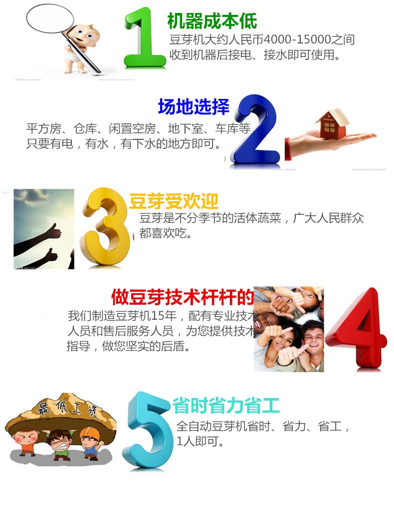 對(duì)來(lái)本廠購(gòu)機(jī)的客戶,我們專車到車站接送,并報(bào)銷一部分來(lái)回火車票、汽車票,在本工廠參觀學(xué)習(xí)期間,免費(fèi)提供食宿,我們以“我誠(chéng)信、你放心”經(jīng)營(yíng)理念與客戶建立和諧的、共發(fā)展共榮辱的合作關(guān)系,讓我們的產(chǎn)品去說(shuō)話! 我工廠內(nèi)擁有大型豆芽生產(chǎn)車間,常年生產(chǎn)豆芽和特色芽苗菜,每天出產(chǎn)豆芽4000斤以上,銷往青州孟七農(nóng)貿(mào)市場(chǎng)和各大及學(xué)校食堂,歡迎各界朋友來(lái)我處參觀考察,將現(xiàn)場(chǎng)試機(jī)和免費(fèi)培訓(xùn)生產(chǎn)技術(shù)。 工廠內(nèi)大型培育基地,免費(fèi)培訓(xùn)30多種芽苗菜生產(chǎn)技術(shù)!